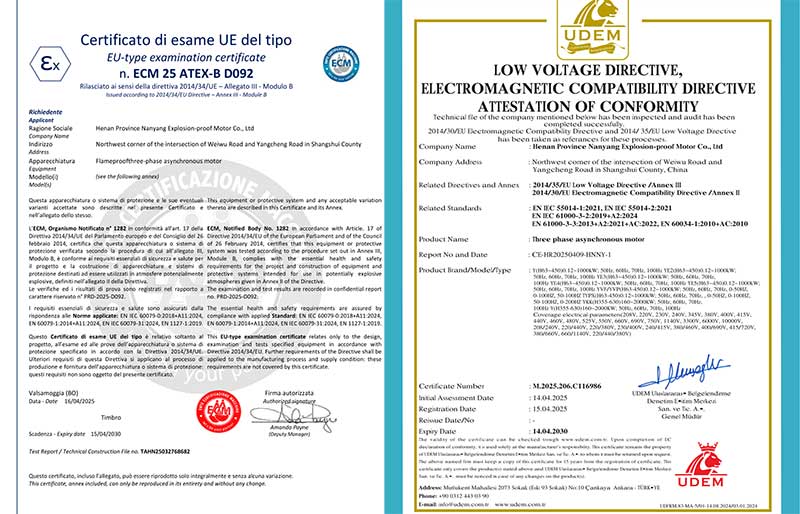 近日,河南省南洋防爆電機有限公司傳來喜訊:公司自主研發(fā)生產(chǎn)的防爆電機產(chǎn)品,順利通過權威機構的嚴格檢測與審核,正式獲得CE認證證書與ECM 25 ATEX-B D092證書。這兩項國際權威認證的取得,不僅標志著南洋防爆電機的產(chǎn)品質量、安全性能達到了國際標準,也為企業(yè)進一步拓展海外市場奠定了堅實基礎。
